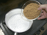 深さのある鍋に、タピオカ澱粉・いもくず・黒糖粉を混ぜ合わせ、 よく混ざったら水を入れて中火にかける。